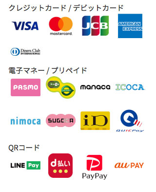 当店は以下の決済方法に対応しています。カード払いはもちろん、電子マネーもOKです。